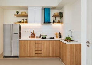 اکسسوری و لوازم برقی یکی دیگر از مواردی می باشد که میتوان با استفاده از آن زیبایی و جذابیت نمای آشپزخانه دو چندان خواهد شد. از وسایلی که دم دستی شما است و برای کار و آشپزی از آن استفاده میکنید برای دیزاین اپن آشپزخانه استفاده نمایید. برای مثال میتوانید از سینی کمک بگیرید و داخل آن را با انواع قاشقهای چوبی و وسایل برقی پر کنید و نمای خاصی برای آشپزخانه ایجاد کنید. در تصاویر پایین اپن آشپزخانه با استفاده از انواع اکسسوری تزیین گردیده است. | صنایع چوبی بهجا